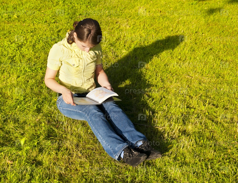 Девушка читает книгу, сидя на траве