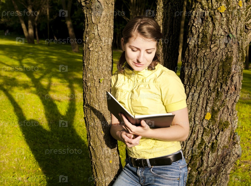Девушка читает книгу, стоя у дерева