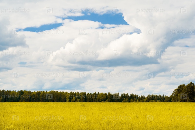 Цветущее желтое поле под голубым небом
