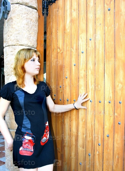 Портрет девушки блондинки возле старинной двери
