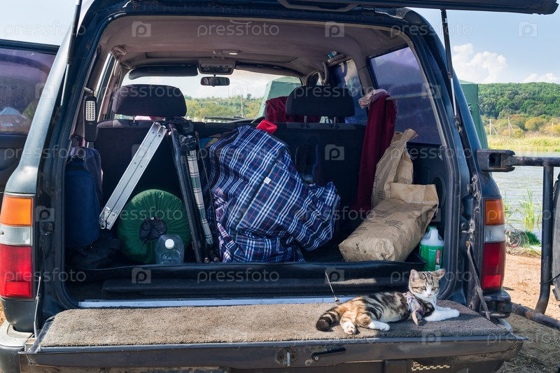Вещи и кот в багажнике автомобиля