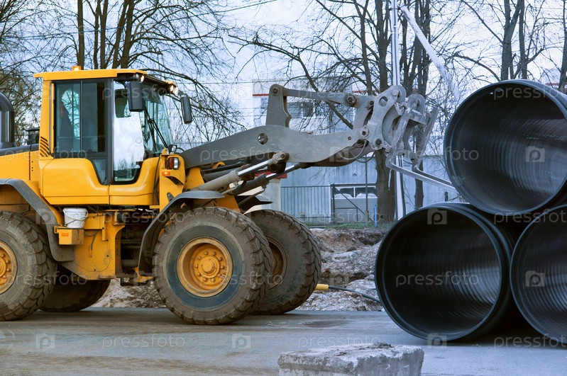 Погрузчик перевозит пластиковые трубы большого диаметра