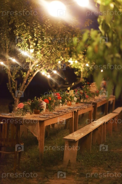 Стол для деревенского открытого ужина в ночь с лампами