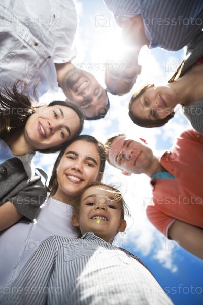 Группа счастливых улыбающихся друзей против голубого неба