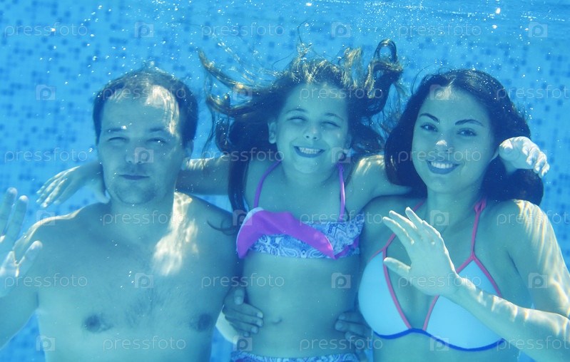 Счастливая семья в плавательном бассейне