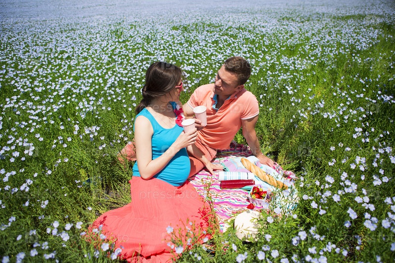 Молодая счастливая красивая пара в поле льна
