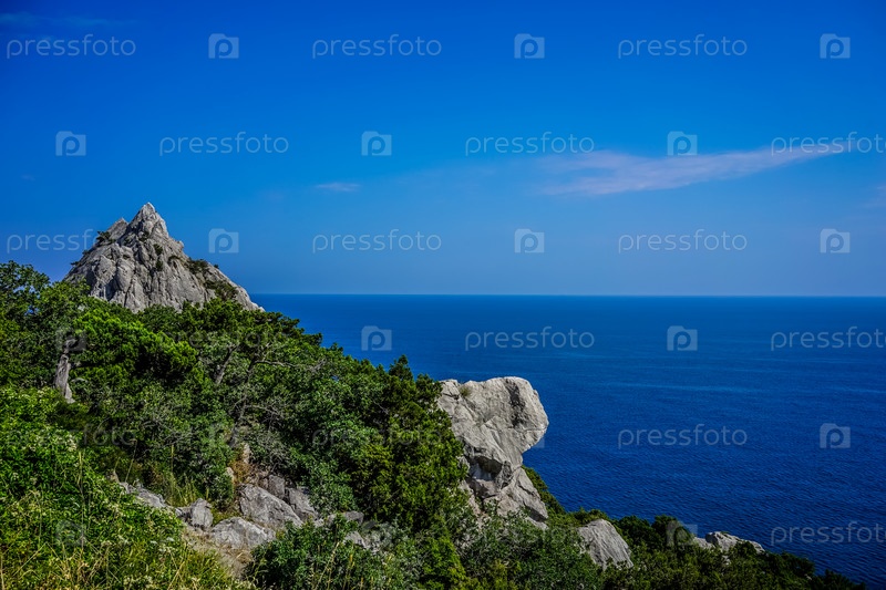 Скала покрыта зеленой растительностью над спокойным синим морем