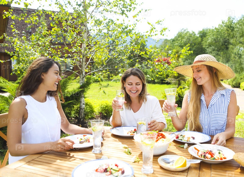 Счастливые друзья на обеде в саду