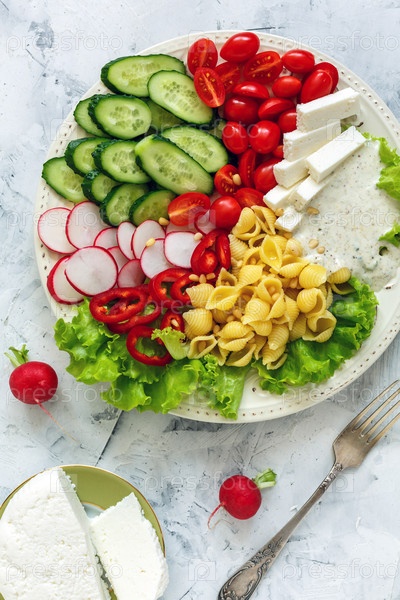 Овощной салат с макаронами, сыром и кедровыми орехами