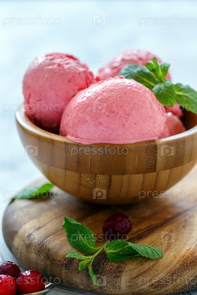 Домашнее клюквенное мороженое в деревянной чашке