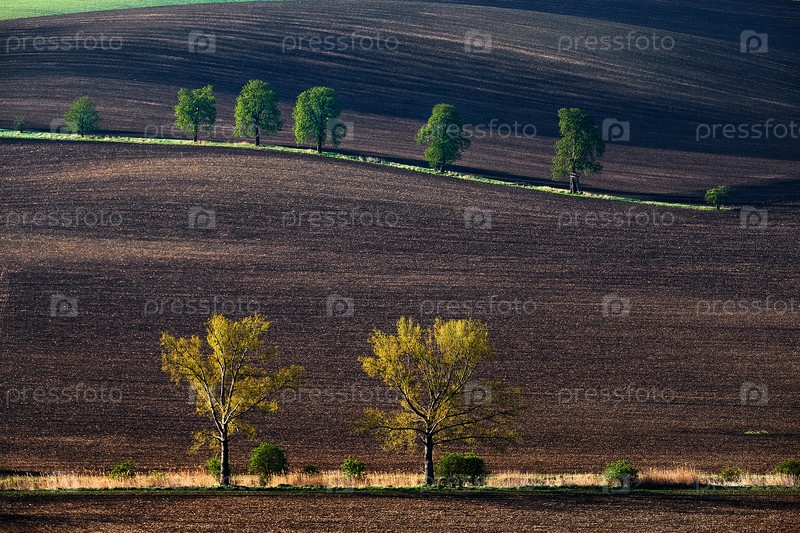 Аллея в конце весны на холмистых полях на закате. Южная Моравия. Чешская Республика
