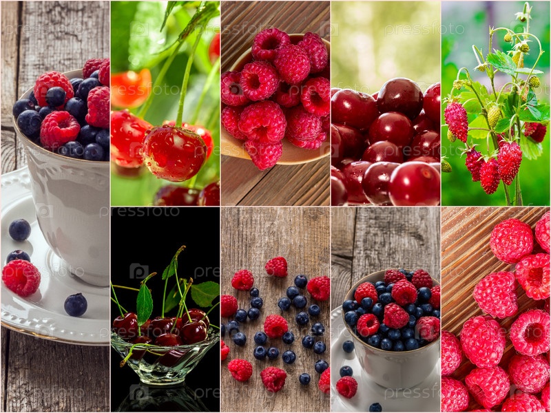Красочный коллаж из различных фруктов и ягод