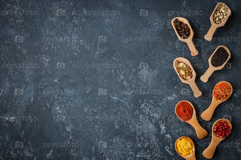 Различные специи в деревянных ложках на темном каменном столе