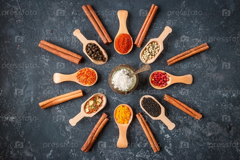 Различные специи в деревянных ложках на темном каменном столе