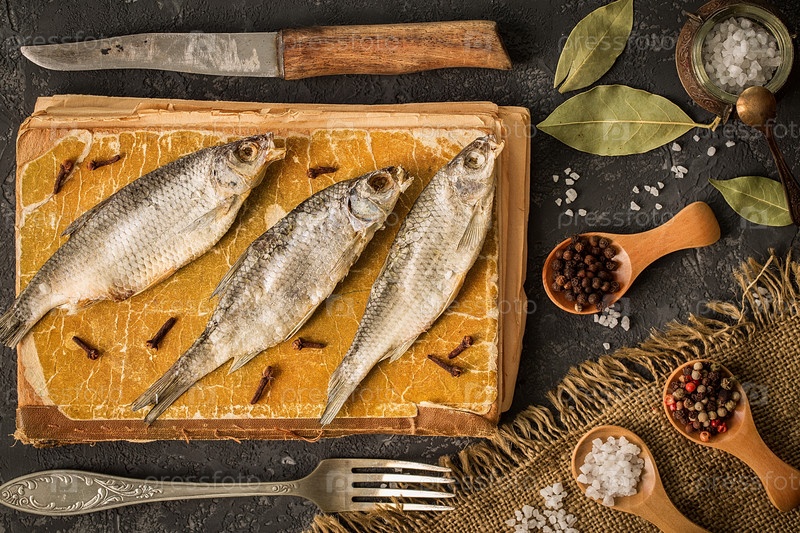 Сушеная рыба на темном фоне