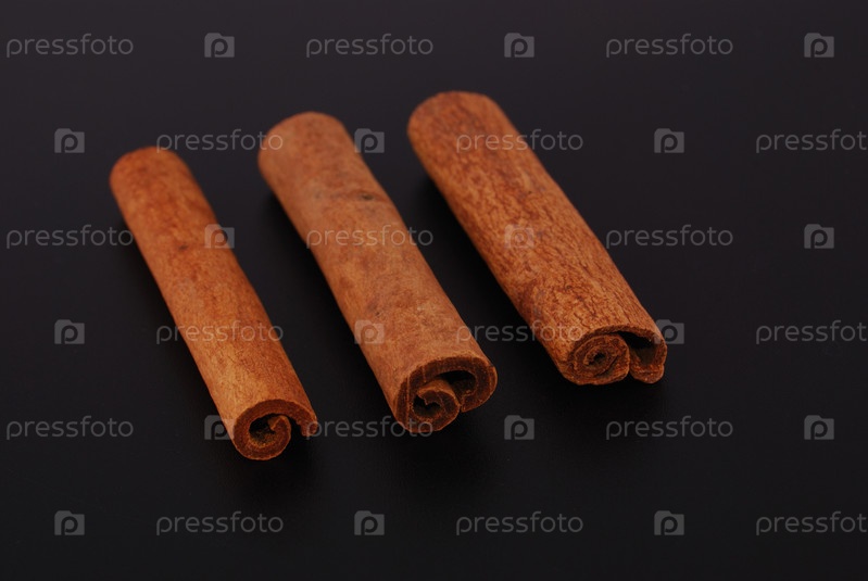 Три палочки корицы на черном фоне крупным планом