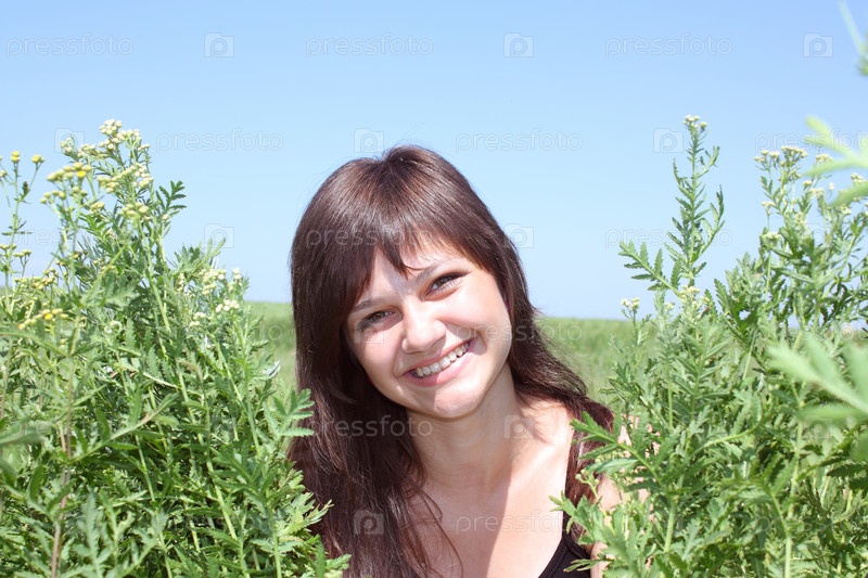 Молодая симпатичная девушка среди травы