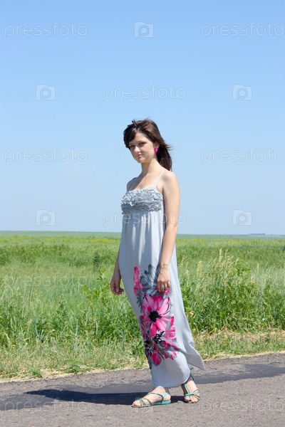 Молодая симпатичная в длинном платье идет по дороге