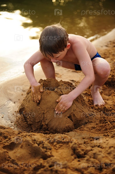 Мальчик строит из песка крепость