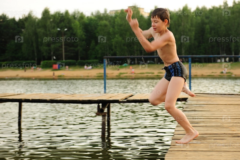 Мальчик прыгает с мостков в озеро