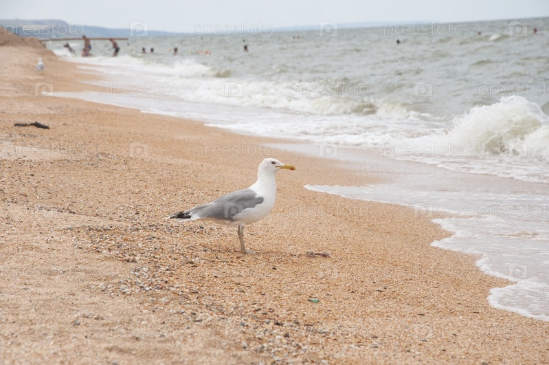 Чайка стоит на морском берегу
