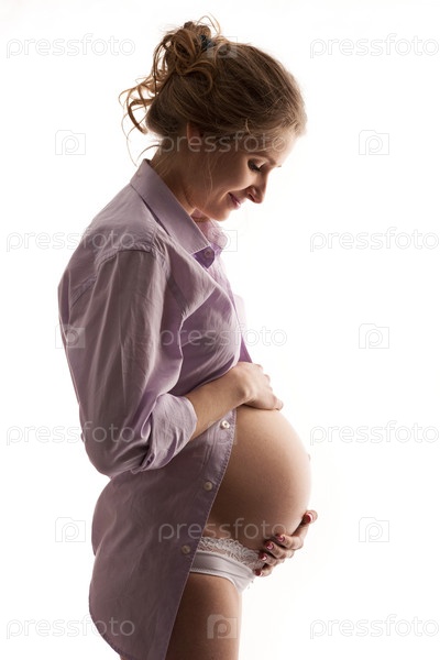 Молодая беременная женщина на белом фоне