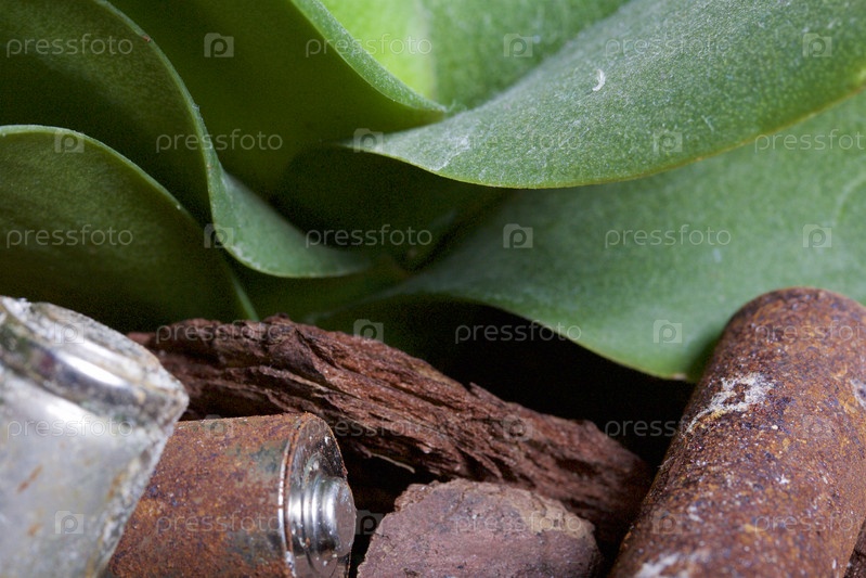 Ржавые батарейки рядом с зеленым растением
