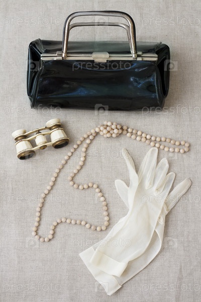 Женские театральные аксессуары. Перчатки, сумочка, ожерелье и театральный бинокль