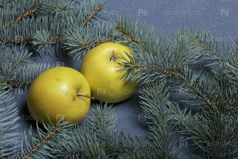 Яблоки среди ветвей голубой ели