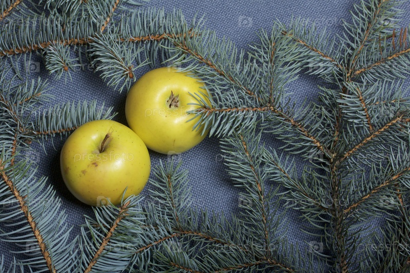 Яблоки среди ветвей голубой ели