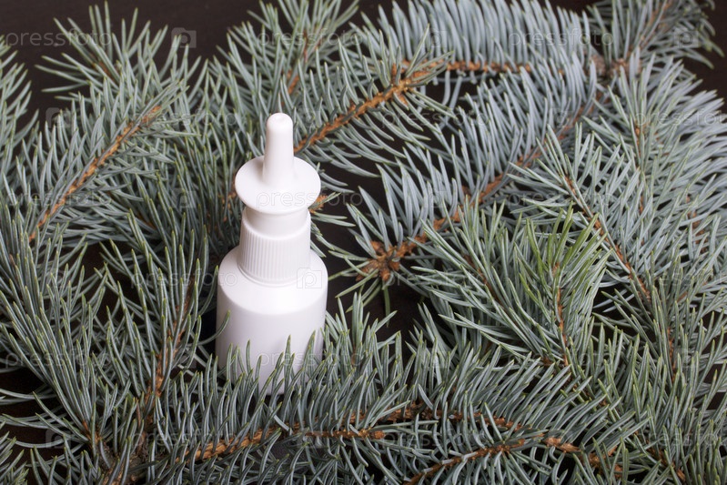 Назальный спрей в окружении ветвей голубой ели