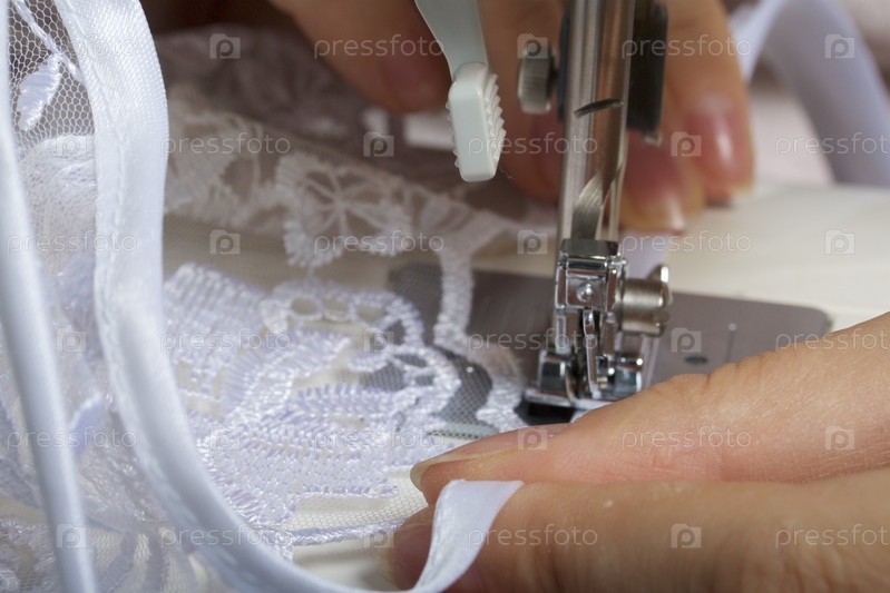 Женщина работает на швейной машине. Пошив кружевной ткани