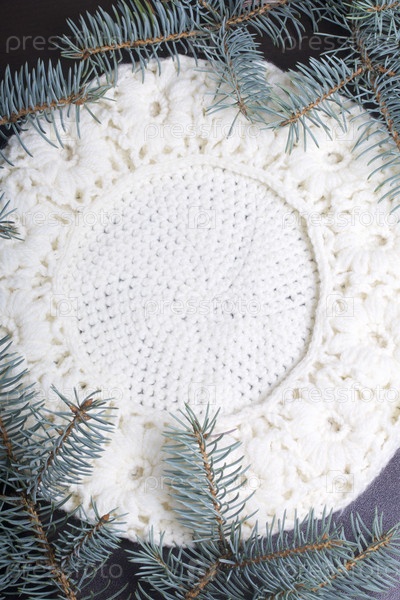 Вязаный берет среди ветвей голубой ели