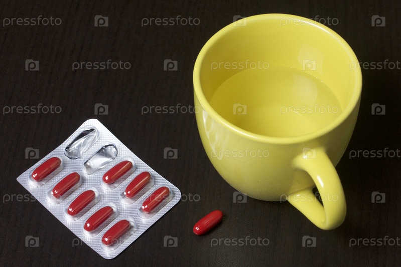 Блистер с красными таблетками и кружка с водой