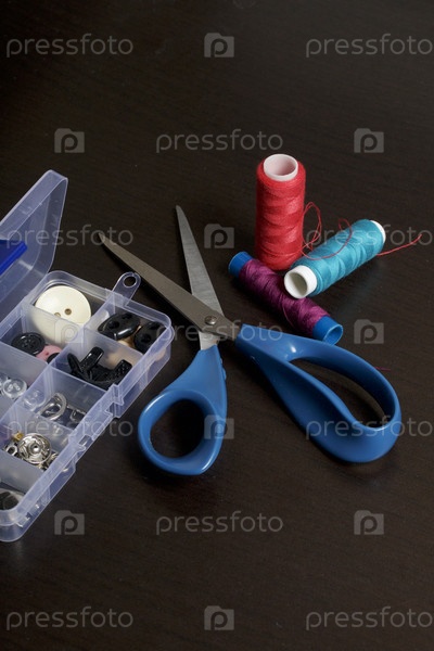 Коробка со швейными принадлежностями и катушки ниток