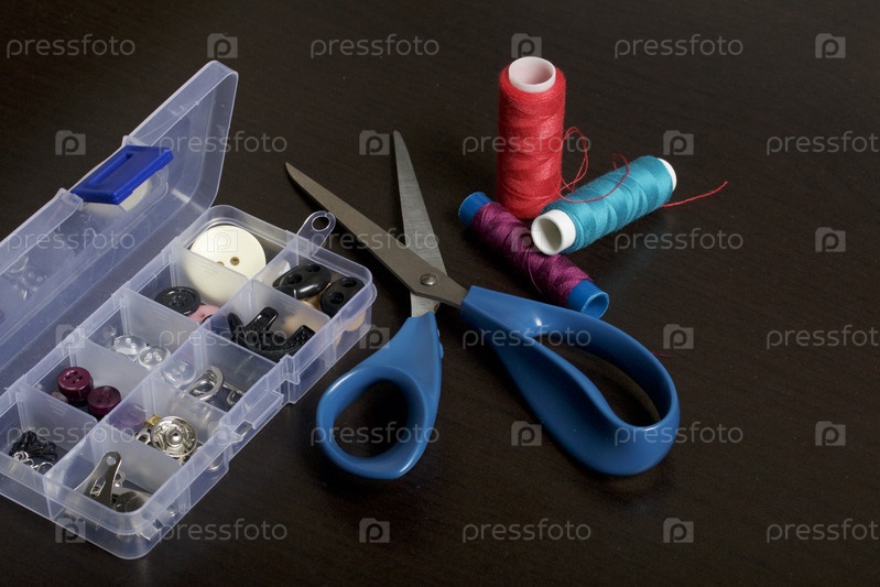 Коробка со швейными принадлежностями и катушки ниток