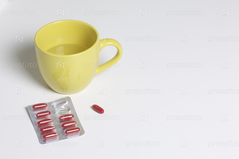 Блистер с красными таблетками и кружка с водой