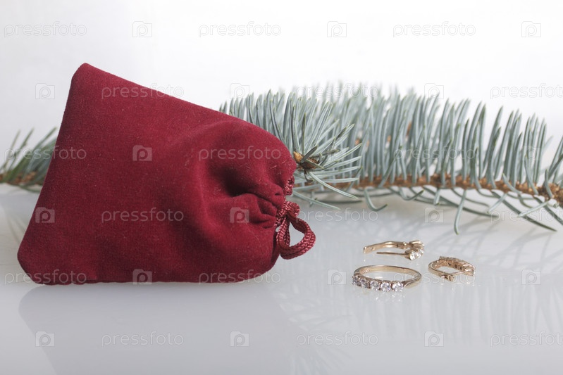 Подарок любимому человеку. Бархатная красная сумка, золотое кольцо и золотые серьги