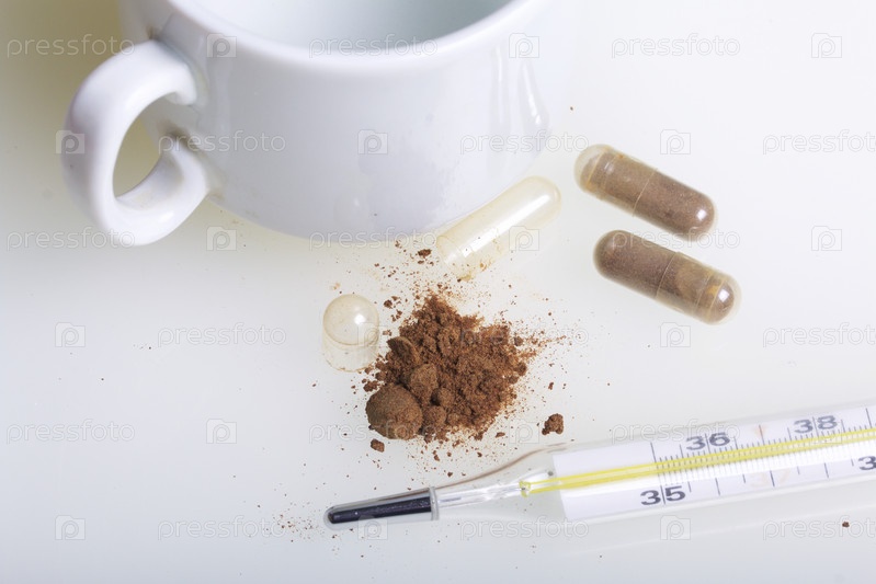 Коричневые таблетки и термометр