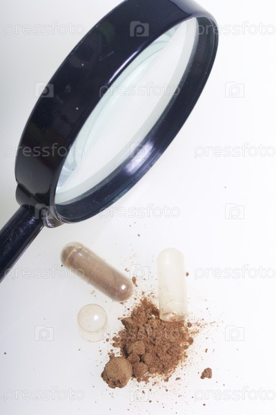 Коричневые таблетки, порошок и лупа