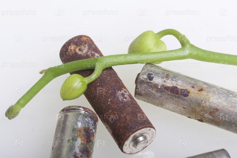 Ржавые старые батарейки рядом с зеленым растением