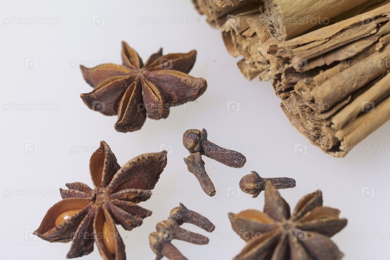 Специи. Корица, гвоздика и анис на белом фоне