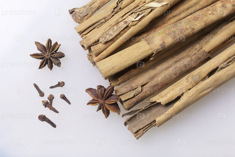 Специи. Корица, гвоздика и анис на белом фоне