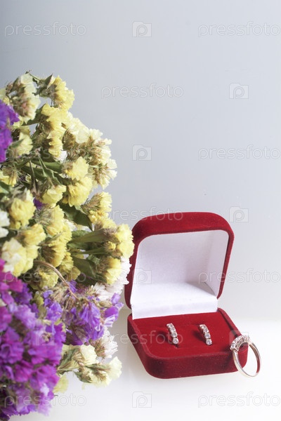 Букет из сухих цветов и открытая бархатная коробка с подарком