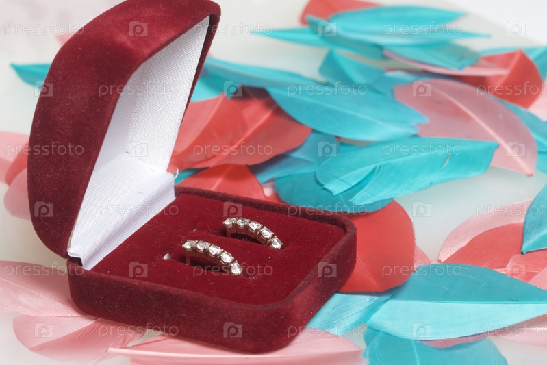 Открытая бархатная коробка с подарком и цветные перья птиц