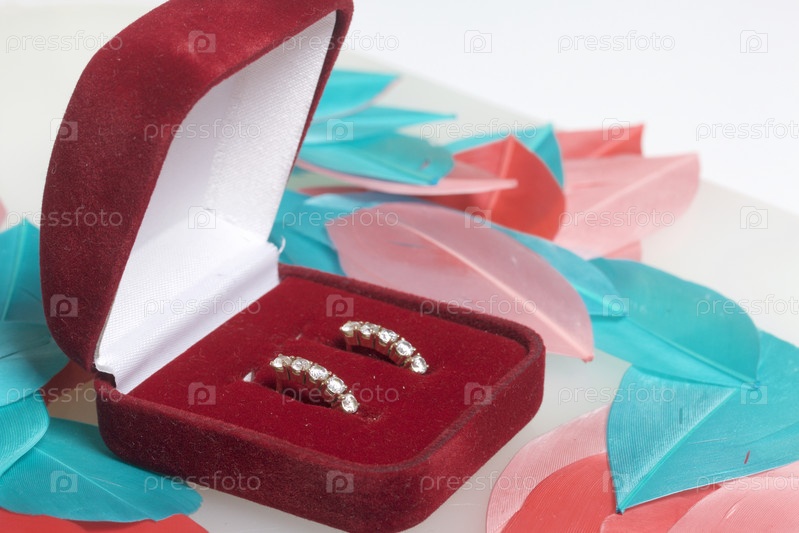 Открытая бархатная коробка с подарком и цветные перья птиц