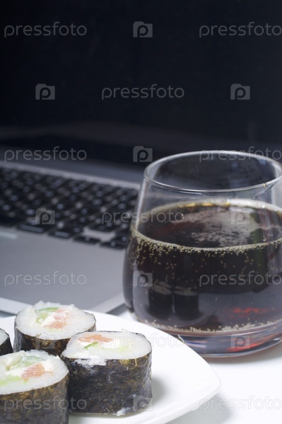 Пиво и суши с ноутбуком