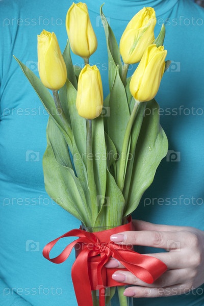 Девушка держит букет желтых тюльпанов