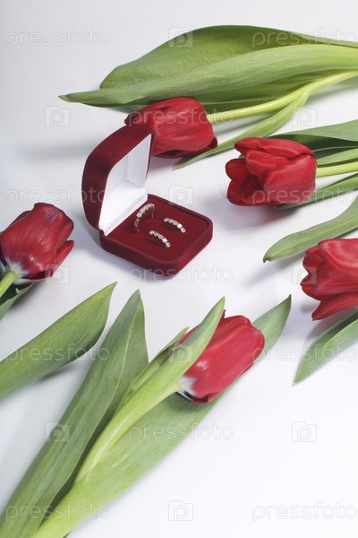 Букет из красных тюльпанов и коробка с кольцом и серьгами