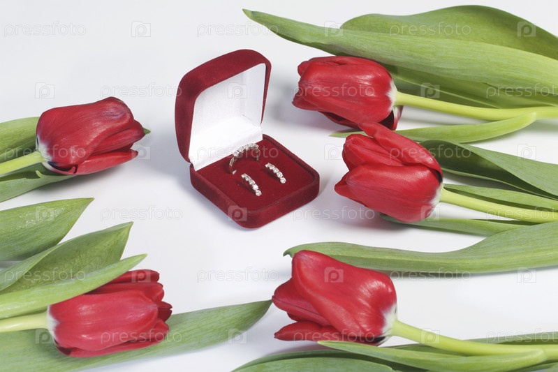 Букет из красных тюльпанов и коробка с кольцом и серьгами